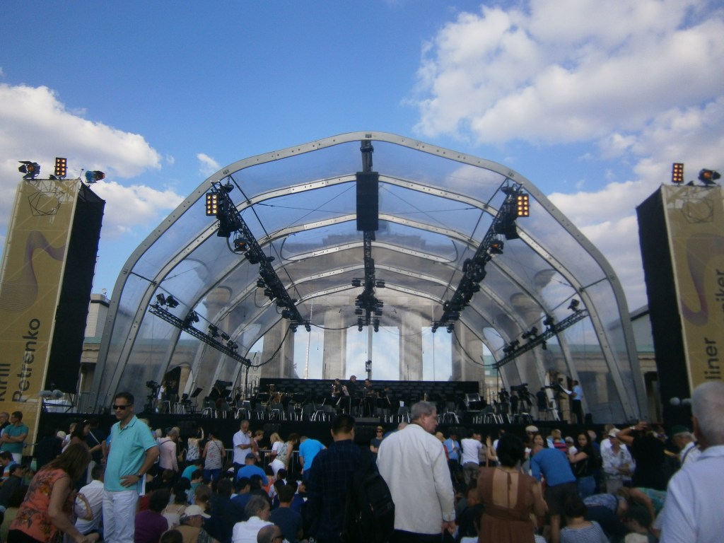 15h27 : on est prêtes. Direction ; la porte de Brandebourg. L’orchestre philharmonique de Berlin a un nouveau chef, Kirill Petrenko et commence la saison par la neuvième symphonie d’un certain Beethoven (Ludwig van de son prénom). Comme le nouveau chef est sympa, il a décidé de donner le même concert, en plein air et gratuit, ce soir du 24 août.