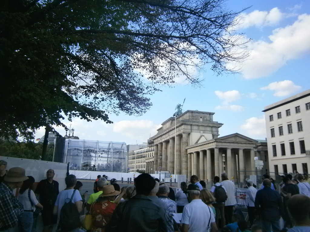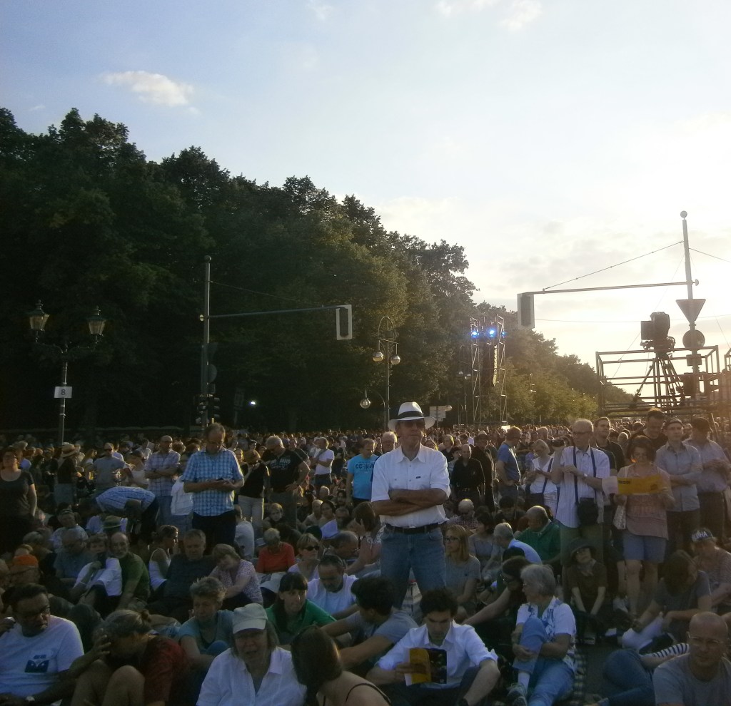 16h32 : on arrive. La scène est dressée devant la porte de Brandebourg, sur l’avenue du 17 juin qui coupe le Tiergarten, une véritable forêt au cœur de Berlin jadis réserve de chasse de l’empereur. Les accès à l’avenue sont fermés.