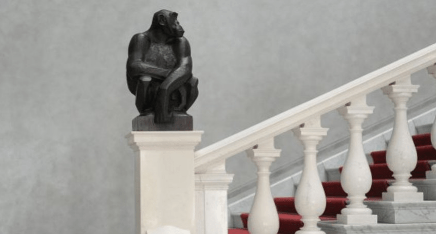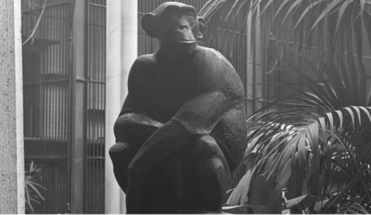 Elle est tranquillement assise sur un coin de la balustrade en marbre du grand escalier. Elle regarde les grands primates du vestibule avec un mélange de dédain et de curiosité. La grâce de son corps puissant est d’un étrange réconfort. Aucune amertume dans son beau visage, mais les souffrances passées ont laissé un éclat de tristesse dans ses yeux. Missie, femelle chimpanzé capturée au Cameroun puis enfermée au zoo de Berlin en 1902 n’a peut-être pas oublié ce que nous, ses cousins germains, lui avons fait subir.